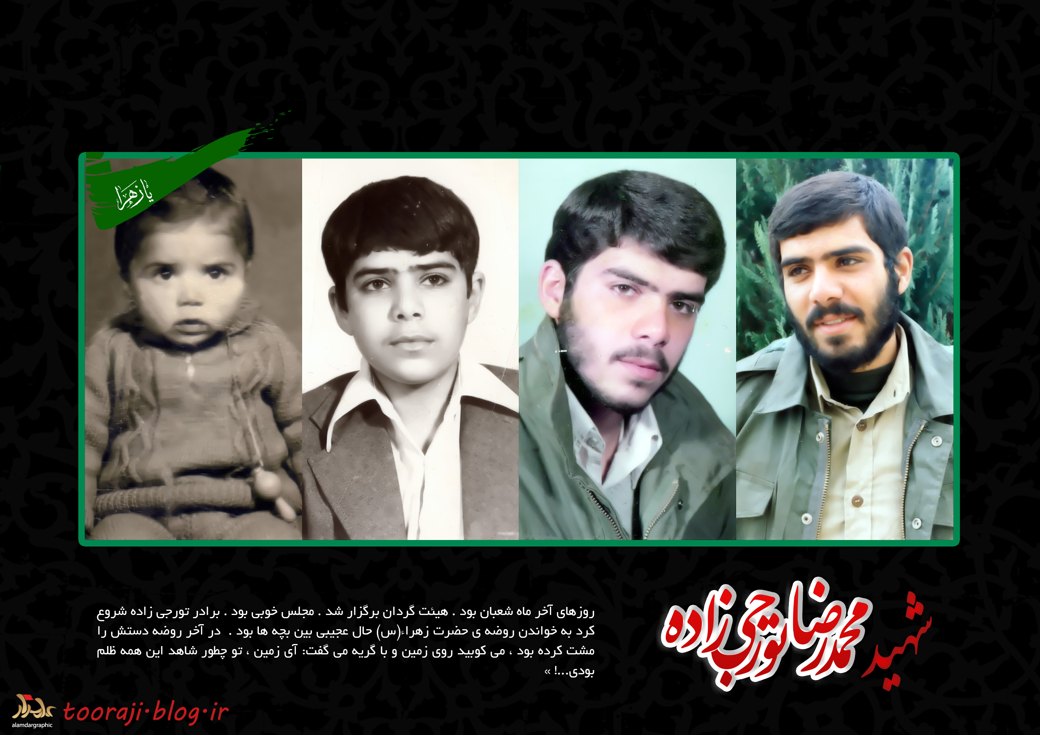شهید محمد رضا تورجی زاده در سال چهل و سه در شهر شهیدان اصفهان به دنیا آمد . در همان دوران کودکی عشق و ارادت به خاندان نبوت و امامت داشته و با شور وصف ناپذیر در مجالس عزا داری شرکت می نمود . در کودکی بسیار با وقار نظیف و تمیز بوده به گونه ای که در میان همگنان ممتاز بود.