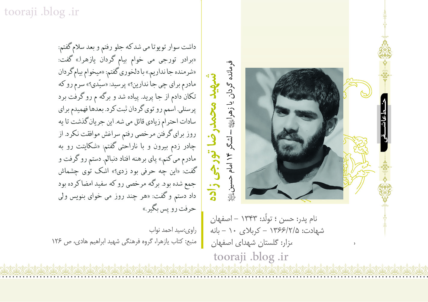 دیگر خسته شده بودم. هر چه بیشتر تلاش می کردم کمتر نتیجه می گرفتم. البته خودم مذهبی و بسیجی و ... نبودم. فقط به نمازم اهمیت می دادم. ولی خیلی شهید تورجی را دوست داشته و دارم.